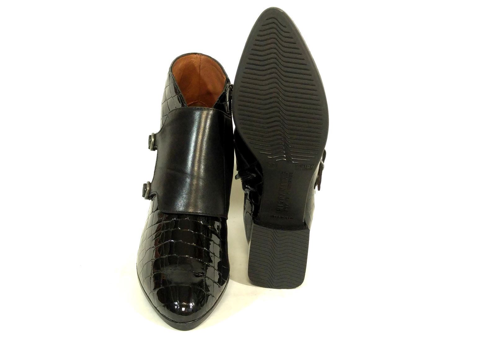 Botín elaborado en napa combinado con charol grabado efecto coco. Tacón bloque. Cierre de cremallera en el lateral y detalle de solapa que cruza el empeine con adorno de hebillas. Una perfecta combinación entre sencillez y diseño. Incorporación de la nueva tecnología TRIFLOW, amortigua cada paso aportando flexibilidad y confort en la pisada.