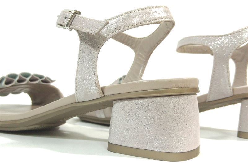 Sandalia de ante con tacón bloque. Detalle de tira con pliegues y perla en la parte delantera. Cierre mediante pulsera con hebilla en el tobillo. El toque lady para tus outfits.