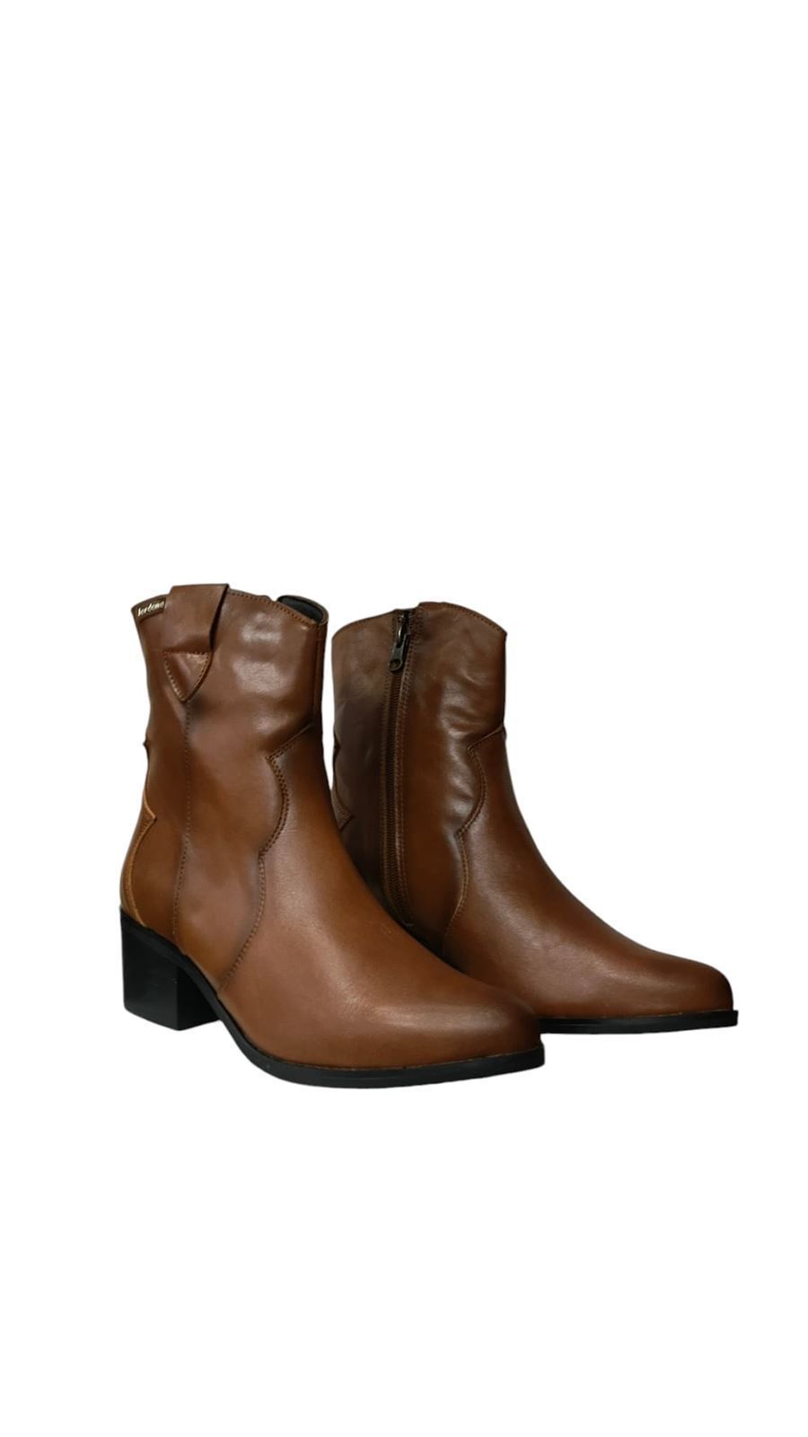 Bota tejana de la marca española Jordana fabricada en piel cuero. Con tacón ancho de 5cm y la punta ligeramente alargada. El modelo de la temporada, son super tendencia las botas tejanas de media caña. La podrás combinar con los outfits mas trendy de tu armario. Cómoda y a la última.
