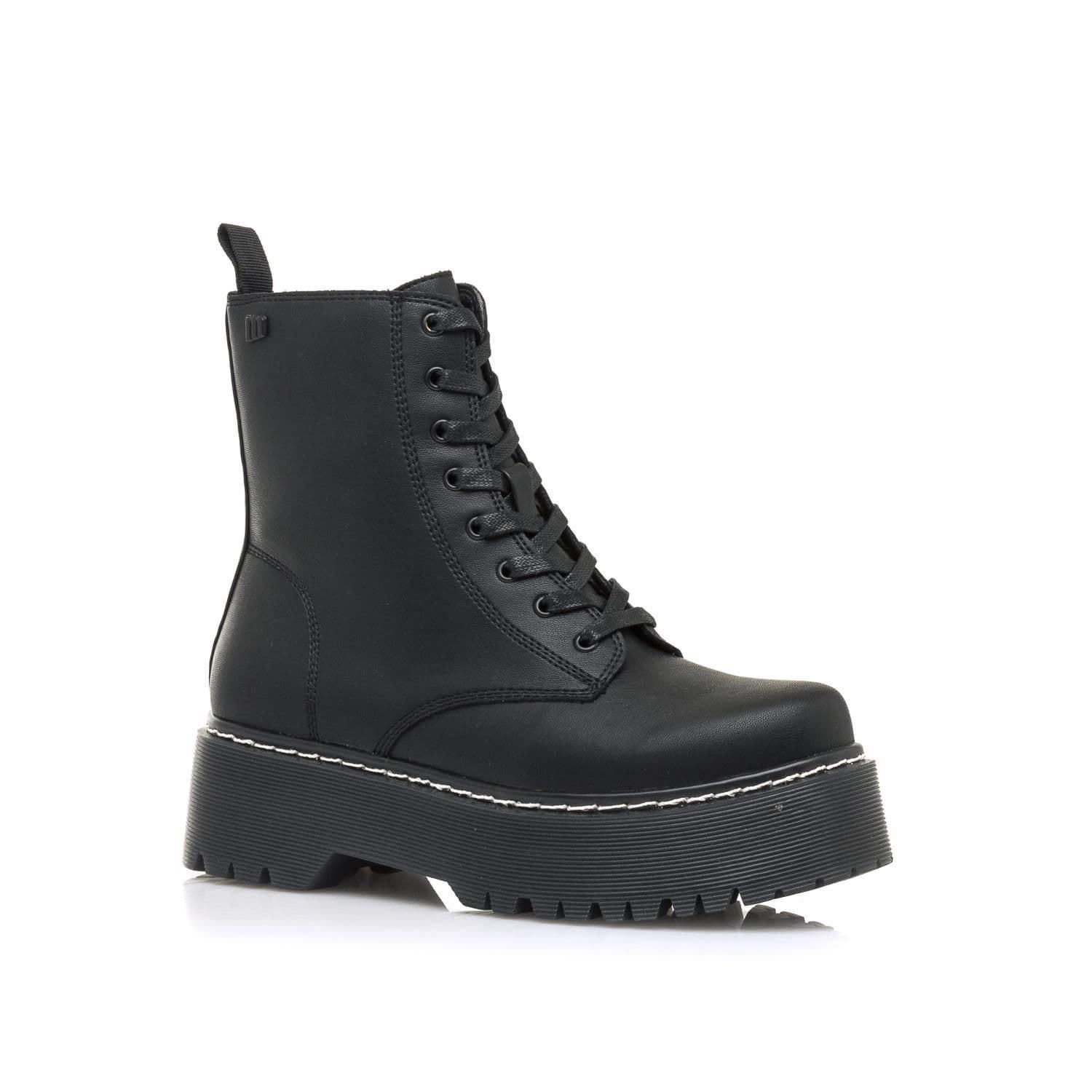 Botín de estilo militar en color negro con cierre de cordones. Tiene suela gruesa de goma dentada y puntera ligeramente levantada para mejorar la pisada. Con detalle de tira en la parte trasera. Rompe las reglas con estas MTNG con personalidad propia.