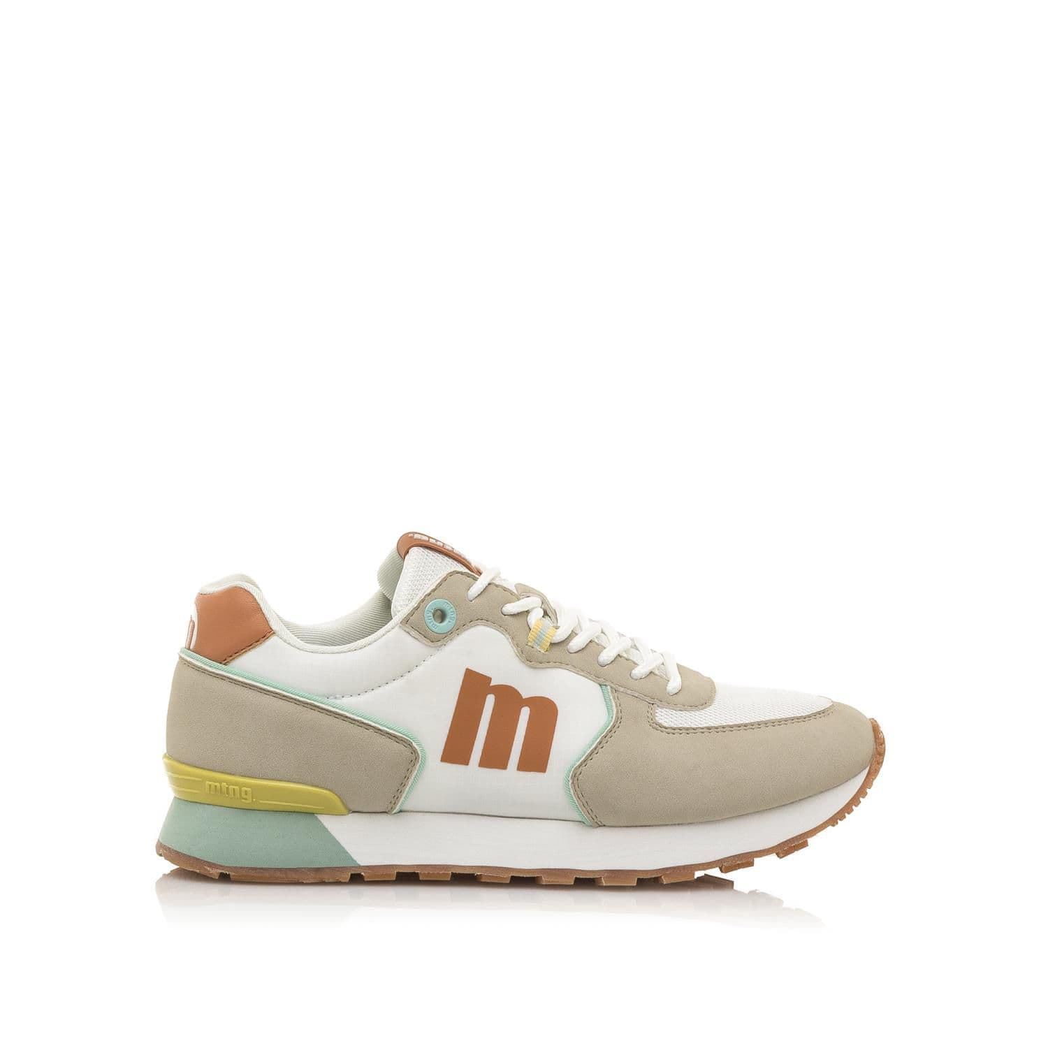 Deportiva mtng de mujer en color blanco con detalles en azules y amarillos y logo de la marca en el lateral en naranja combinando con su trasera. Tiene cordones redondos y paneles combinados en diferentes texturas. Unas sneakers ideales para dar un toque de color a tus looks.