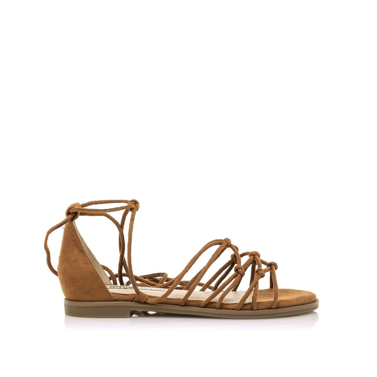 Sandalia plana MTNG en color cuero con tiras por todo el empeine con detalle de nudos y tiras largas para anudar al tobillo. Ideal para cualquier look de este verano