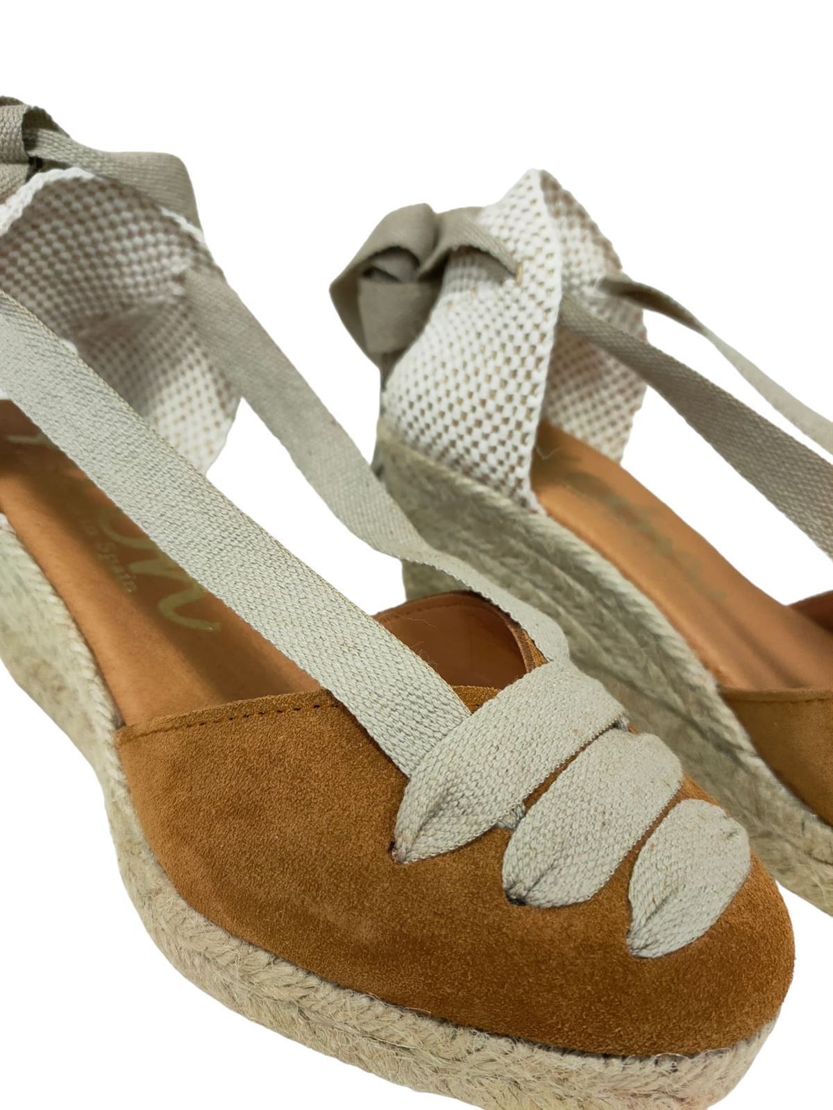 Alpargata de mujer con corte en piel serraje camel, forro de piel y planta de piel acolchada. Piso de yute.