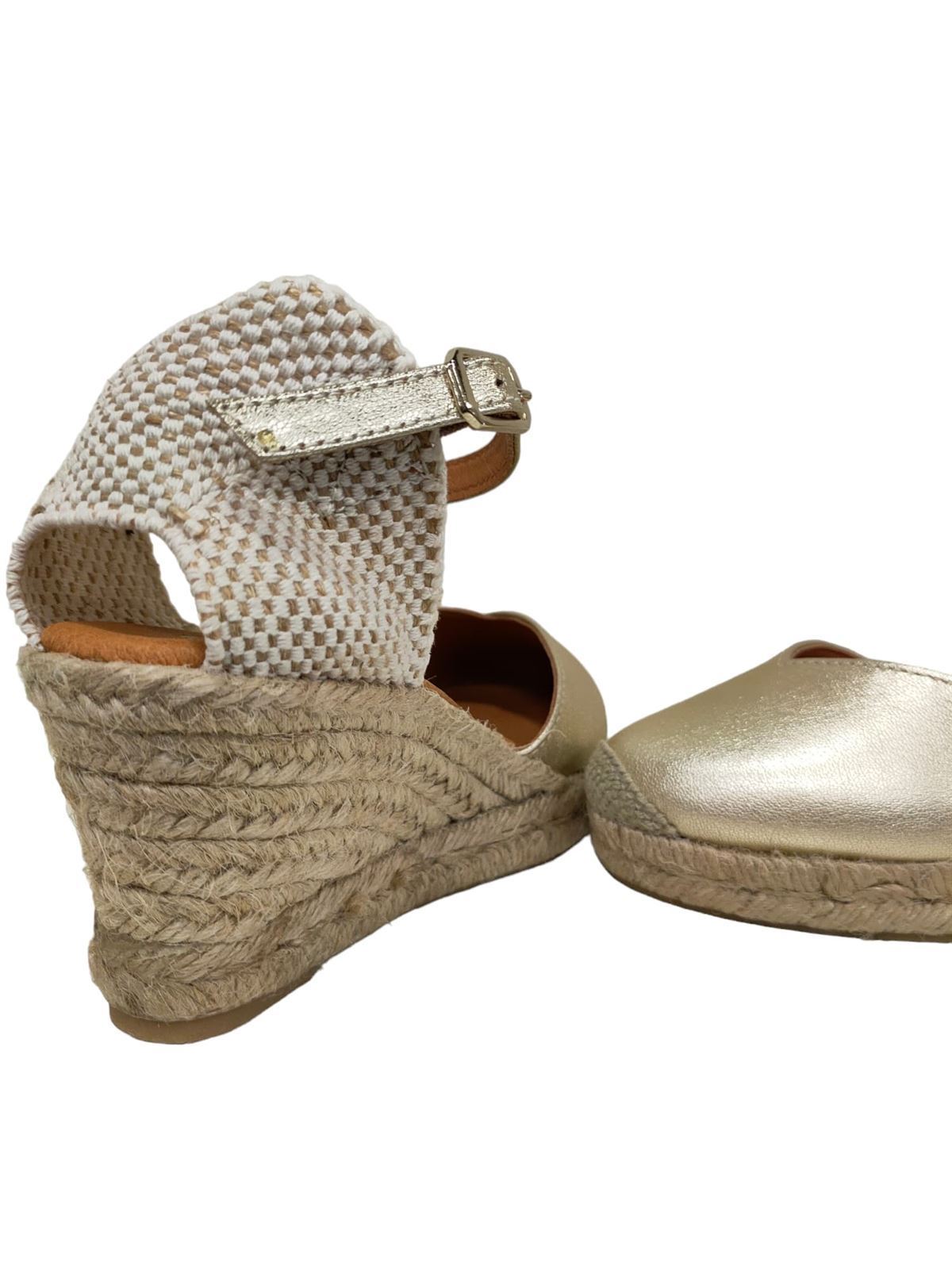 Alpargata de mujer con corte en piel metalizada en dorado, forro y plantilla de piel y planta de yute. Piso de yute.