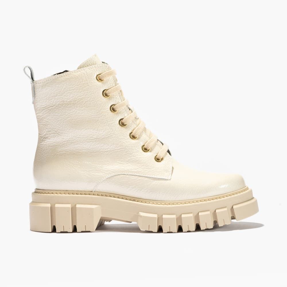 Botín de charol beige con cordones para chica. Viene con cremallera lateral.