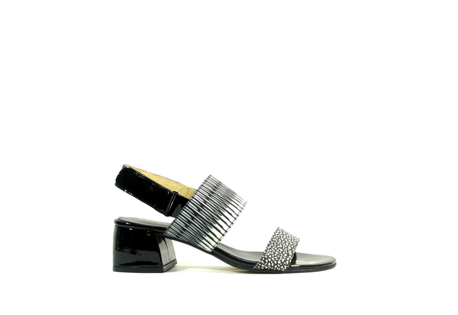 Sandalia de charol en negro y blanco para mujer de la marca española Salonissimos.