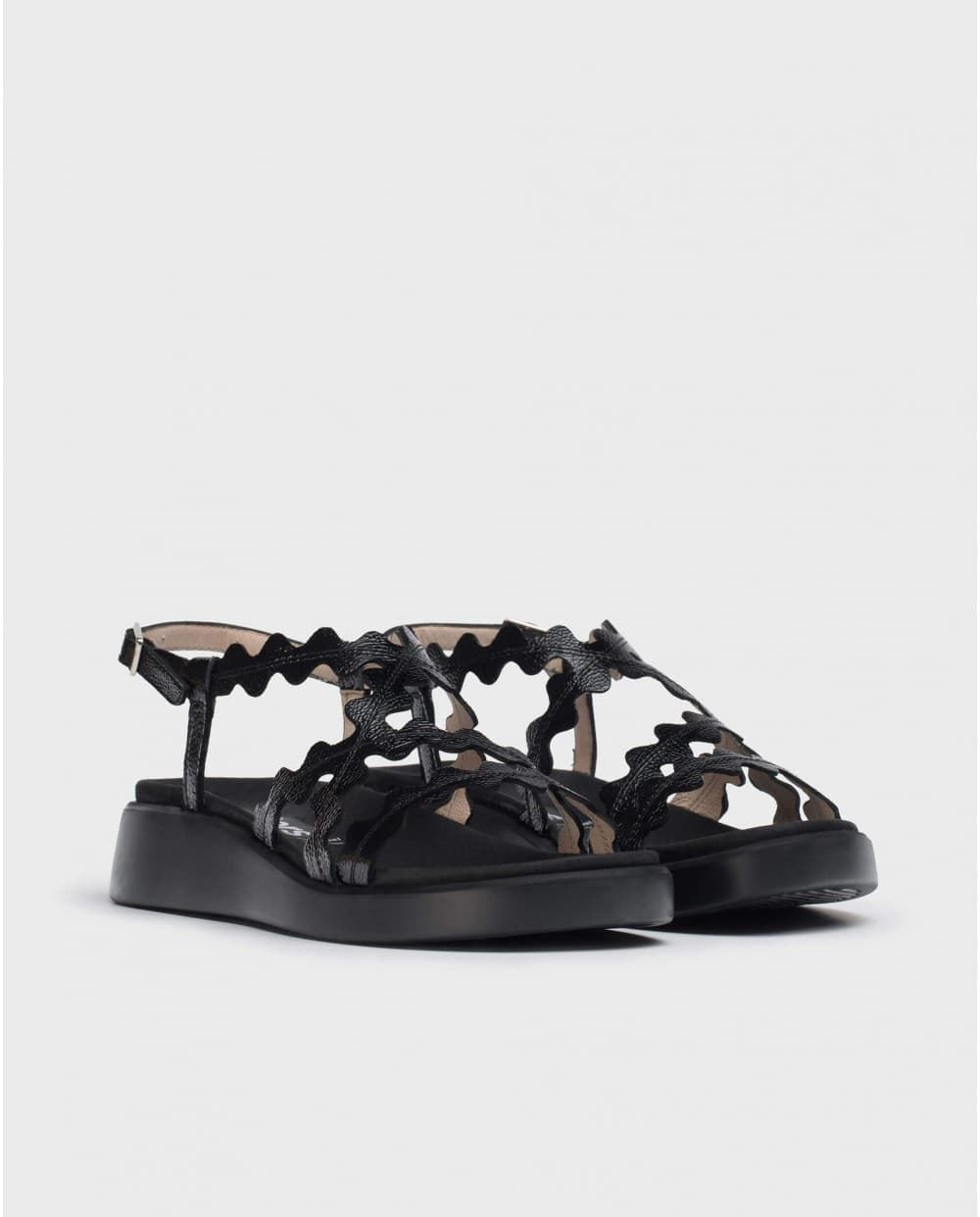 Sandalia plana en charol color negro. Modelo informal de tiras onduladas cruzadas y cierre de tira trasera con hebilla ajustable. Suela ancha desarrollada con tecnología WondersFly ™ garantía de ligereza y confort . Prepárate para la sensación, YES WE FLY